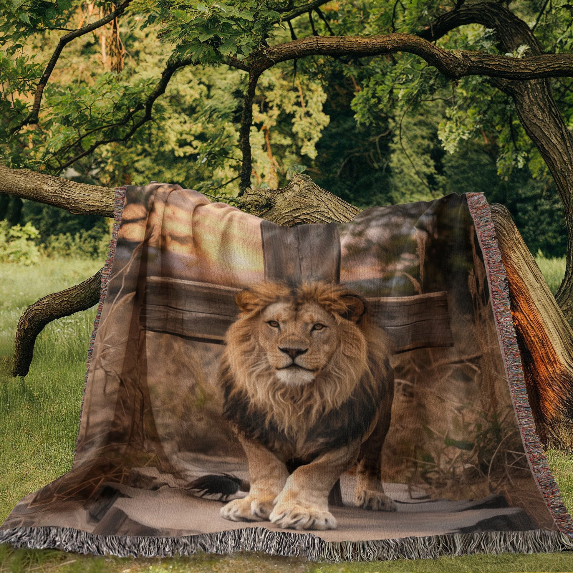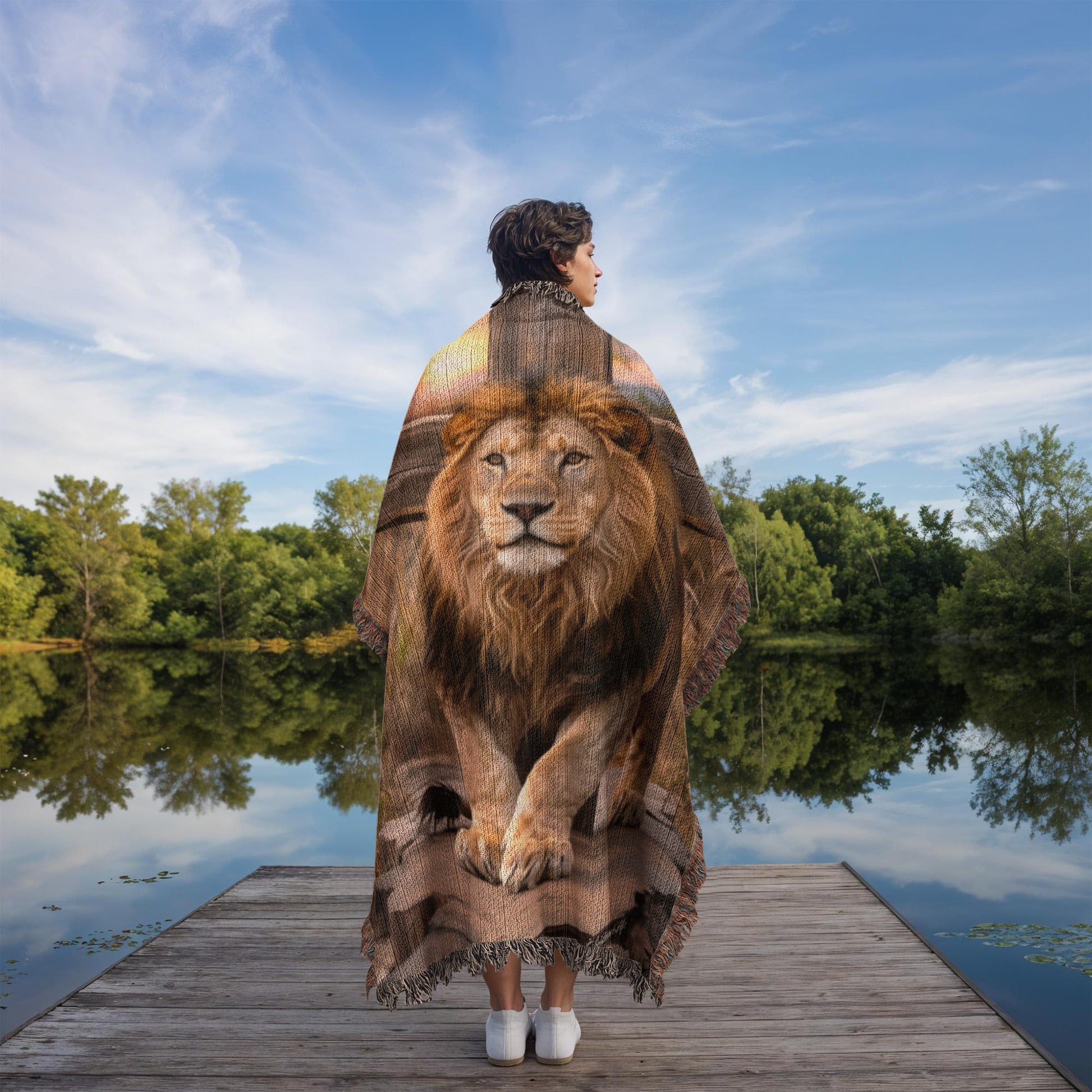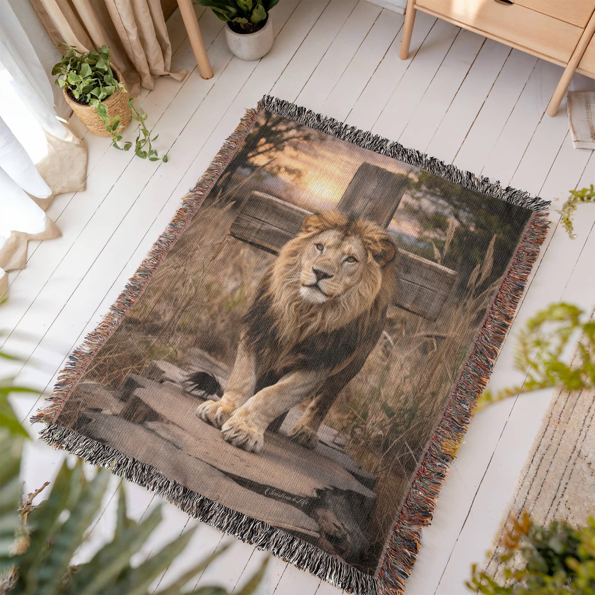 Lion of Judah and Cross Christian Heirloom Woven Tapestry Throw Blanket. This beautiful heirloom blanket features a striking lion and cross design woven into the fabric. It's perfect for adding a touch of faith and style to any room in your home.