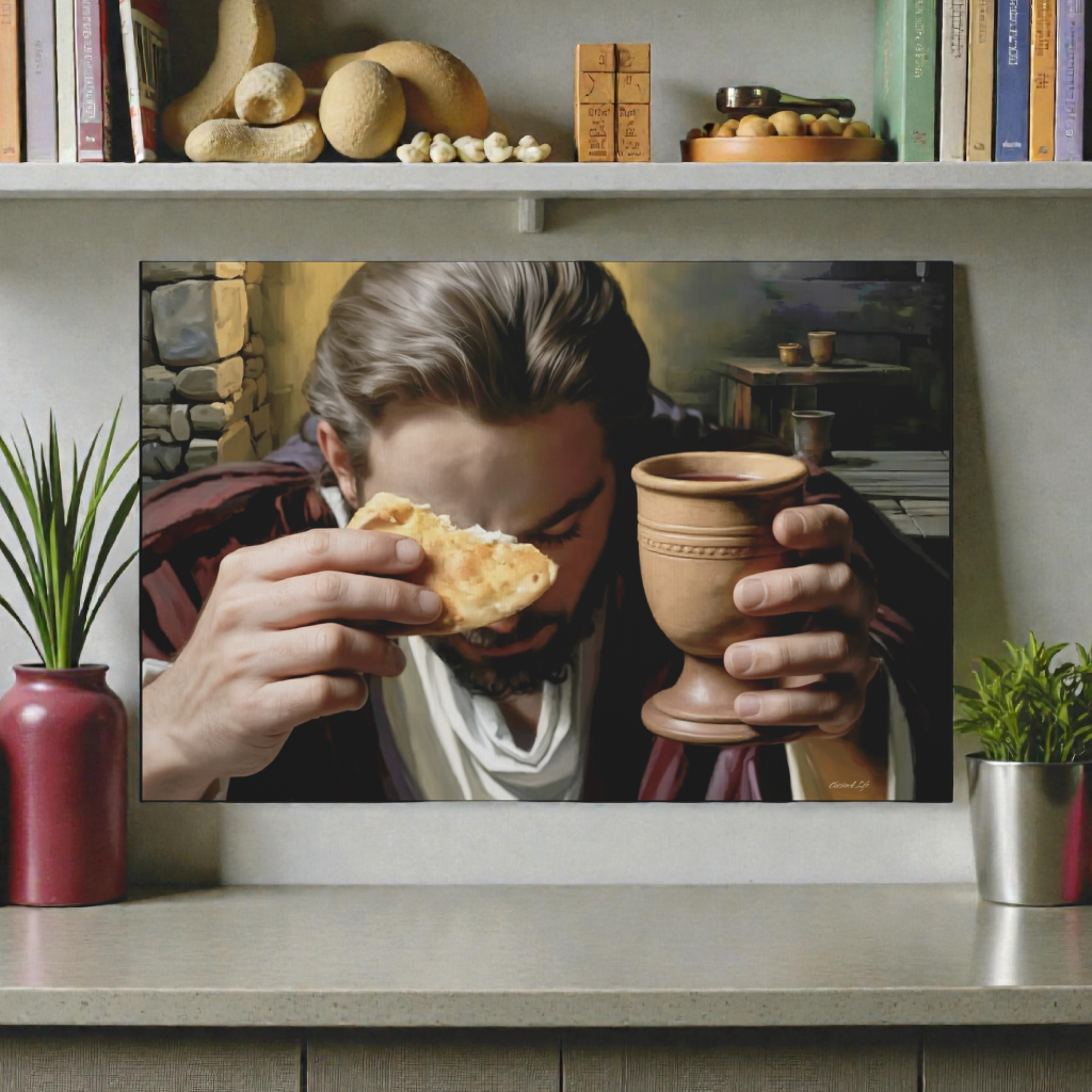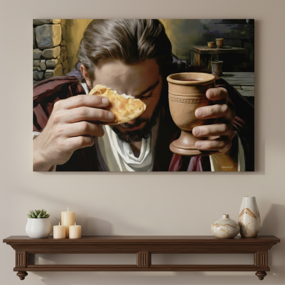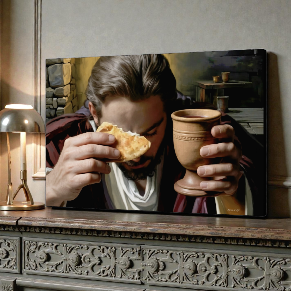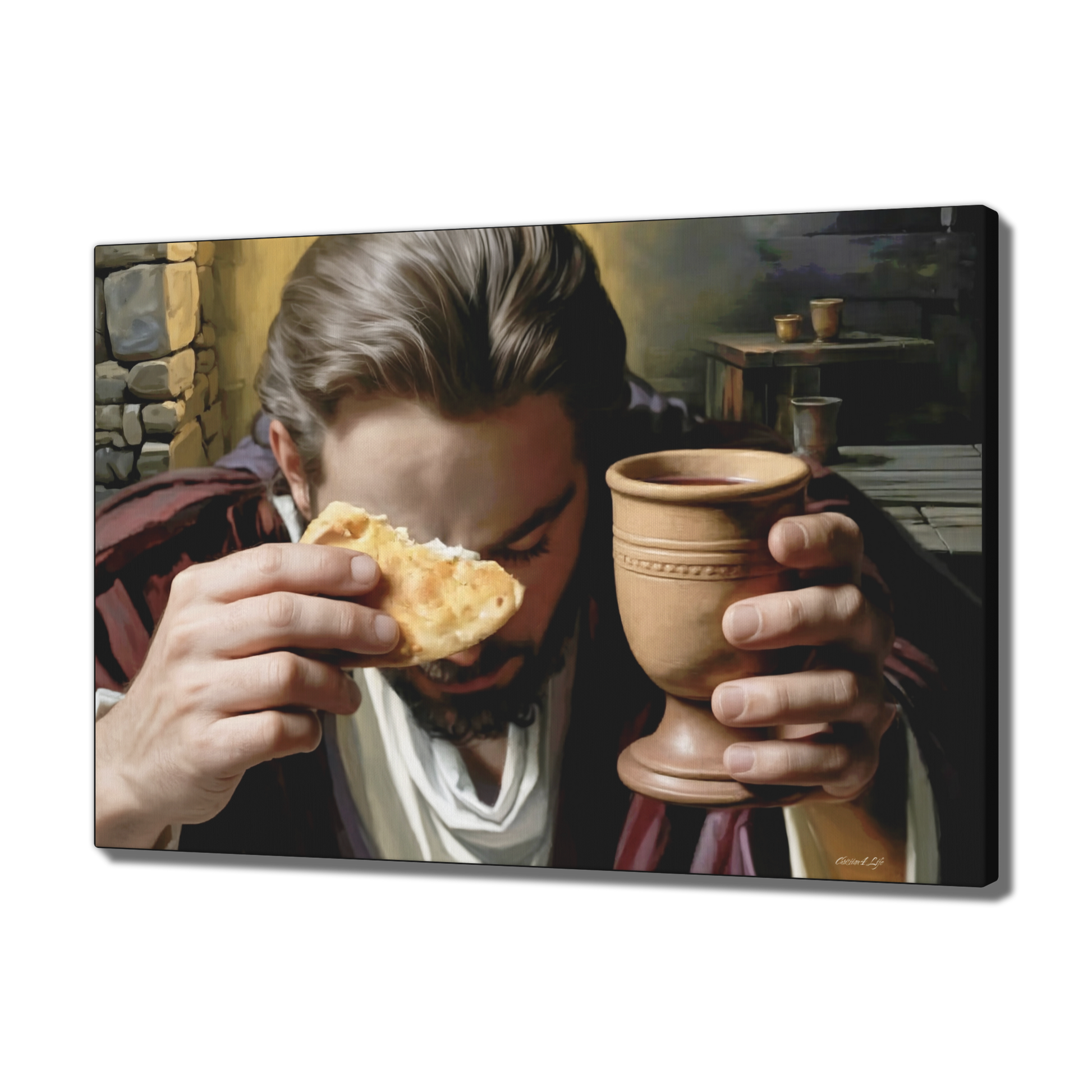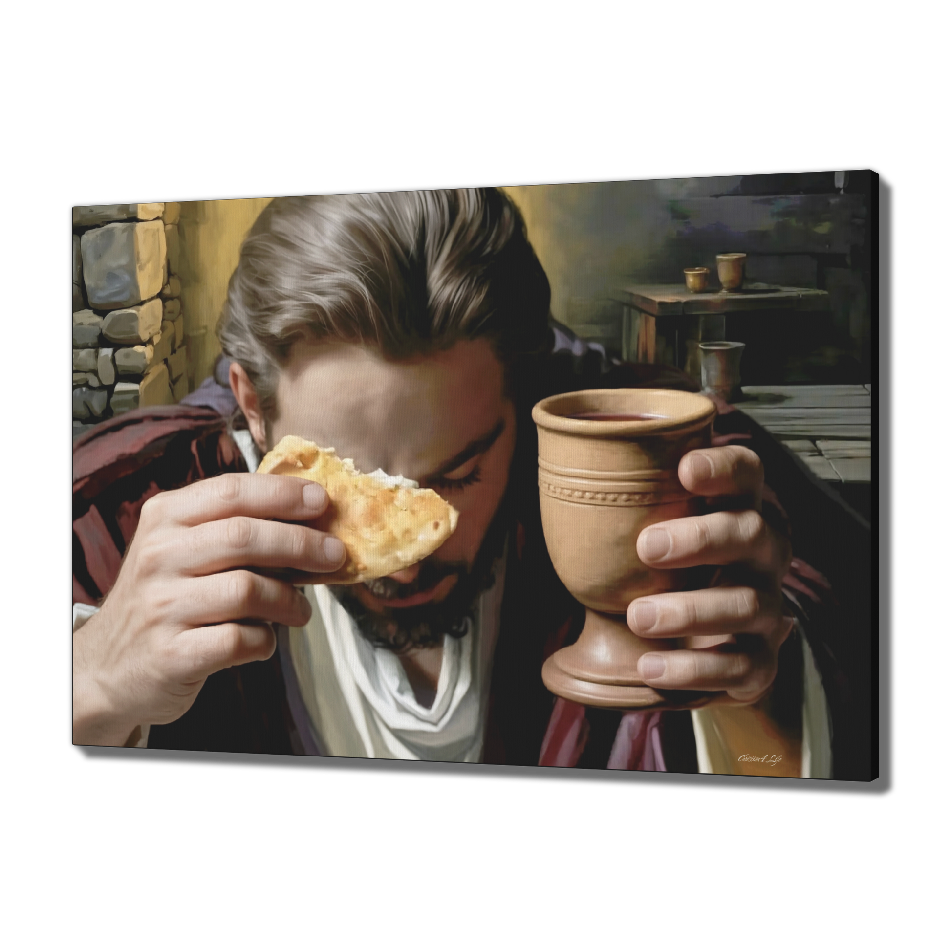 Beautifully crafted wrapped Christian canvas print features a profoundly moving artistic rendition of Jesus in deep prayer at the Last Supper, with His head bowed low and hands gently holding a piece of bread and a chalice of wine. The intricate details of the bread and wine stand out, while Jesus' figure slowly fades into the background, suggesting a spiritual transcendence. The scene is illuminated by a gentle, ethereal light, highlighting the textures of His simple robes and casting delicate shadows. The backdrop subtly reveals a humble chamber, evoking an atmosphere of quiet contemplation and divine connection.