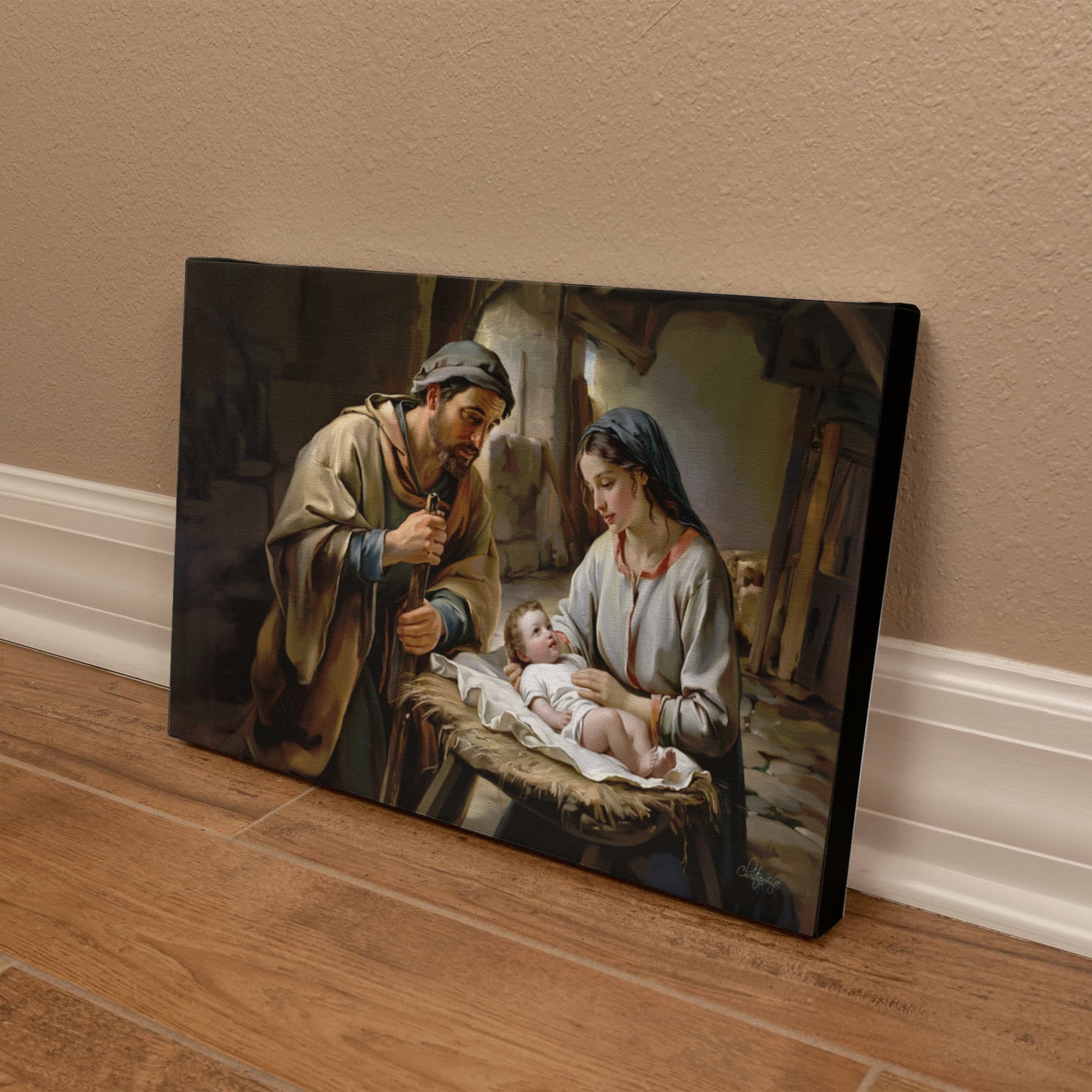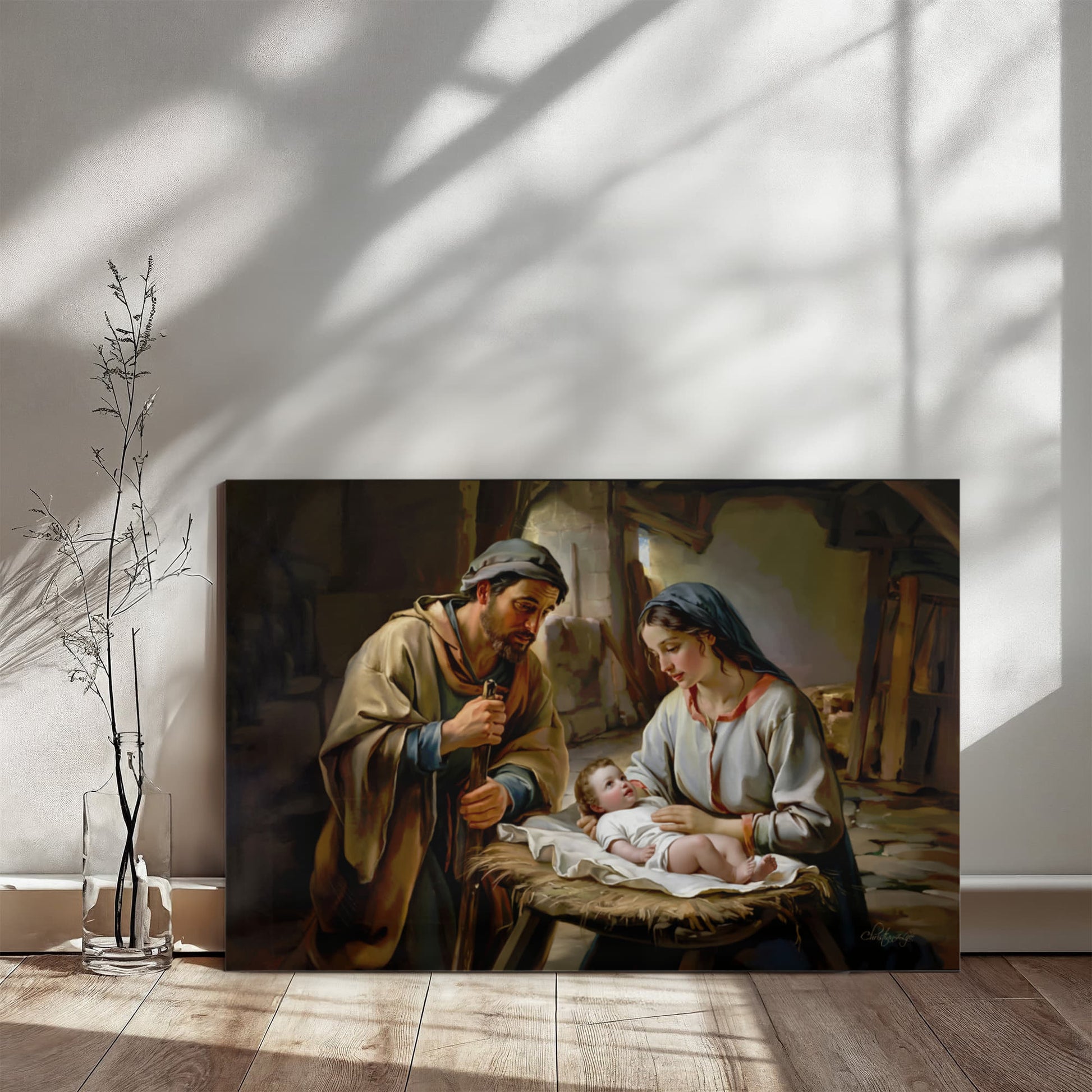 The Nativity scene of Baby Jesus, Mary and Joseph in a stable - Christian Art Canvas