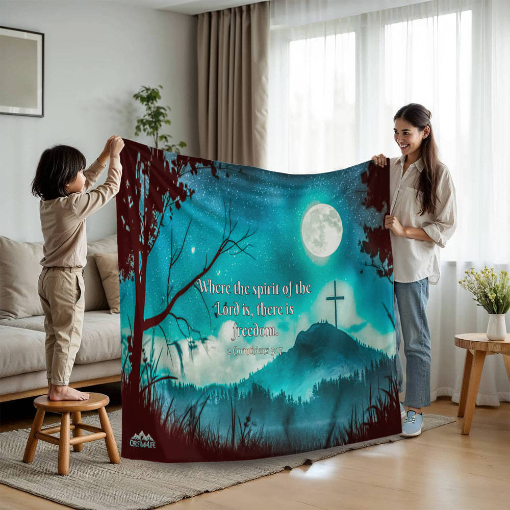 Indulge in pure comfort and serenity with our Mink Touch Fleece Blanket. This exquisite Christian blanket is thoughtfully crafted by Christian4Life, featuring an embroidered image of a peaceful night sky and a silhouette of a wooden cross on a faraway mountain. The gentle glow of the moon, the soft rustling of nature, and the powerful words "Where the spirit of the Lord is, there is Freedom" from Ephesians, all come together to evoke a sense of peace and tranquility. This inspiring Bible quote makes it the perfect Christian gift for a loved one, serving as a reminder of God's love. Don't settle for just any blanket; choose our warm and stylish Mink Touch Fleece Blanket for cozy nights and lazy days. Designed for those who appreciate both aesthetics and functionality, this blanket offers the perfect combination of elegance, comfort, inspiration and warmth. Whether it's a birthday, anniversary, Father's or Mother's Day, or any special occasion,