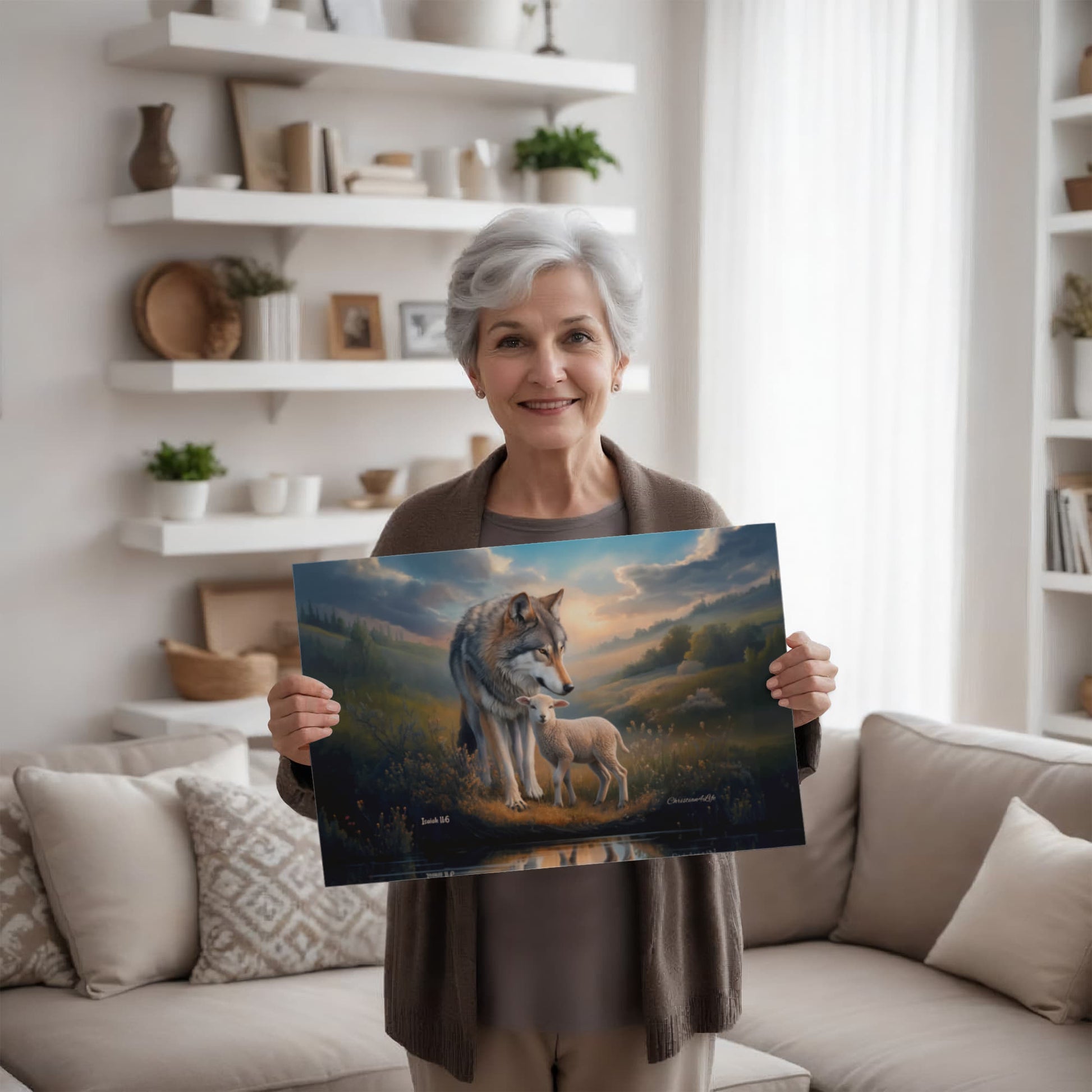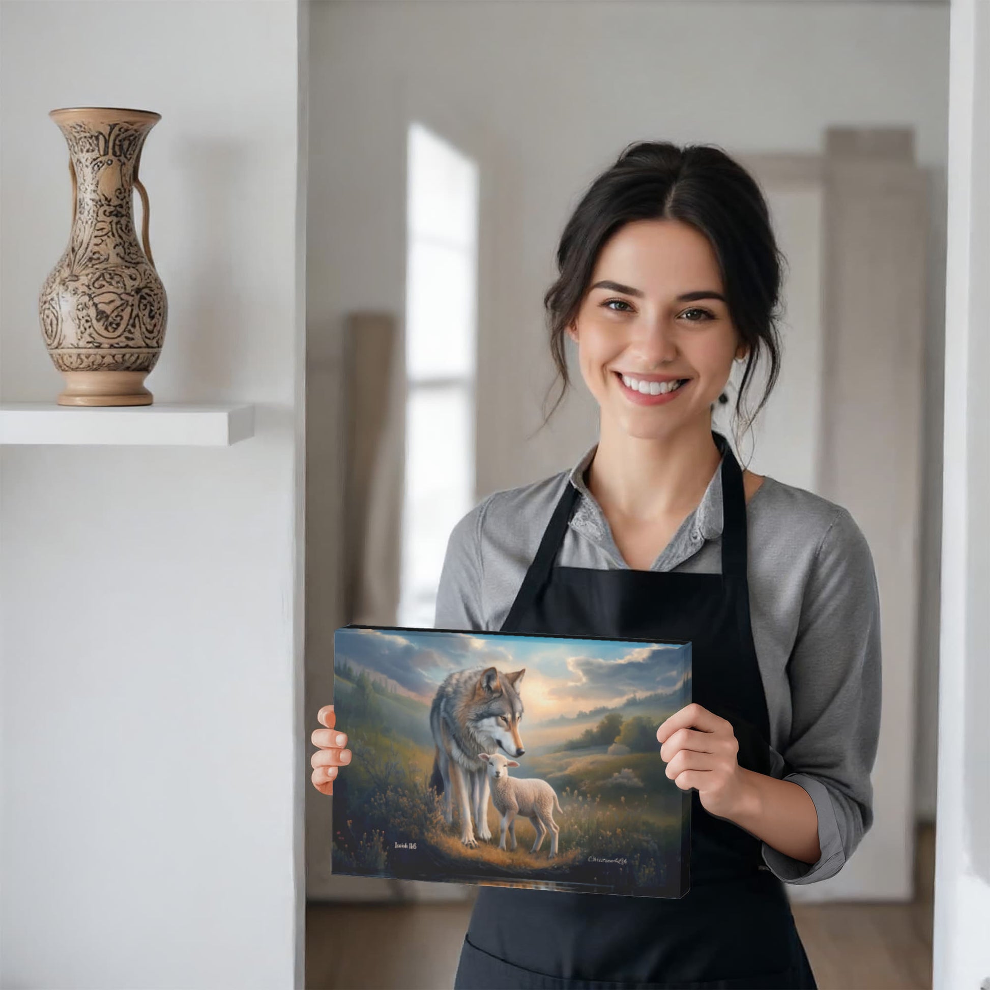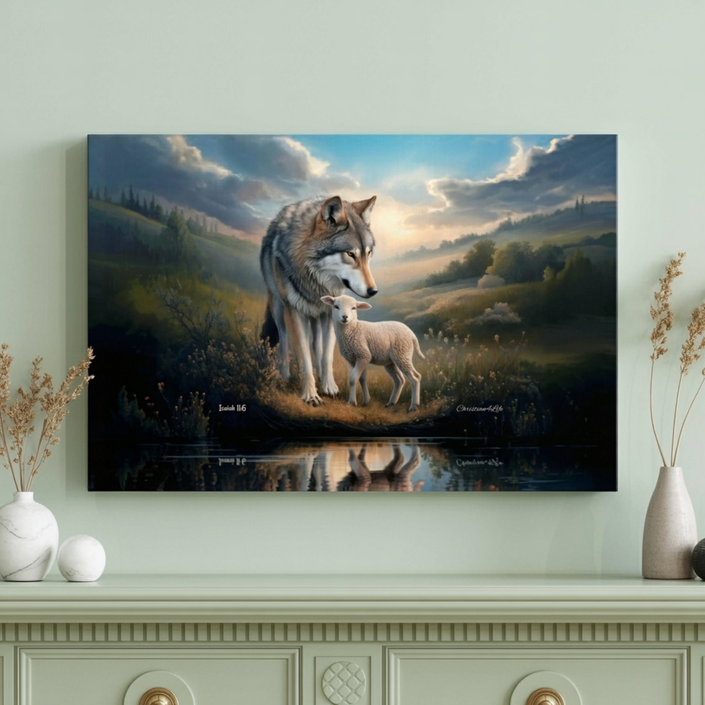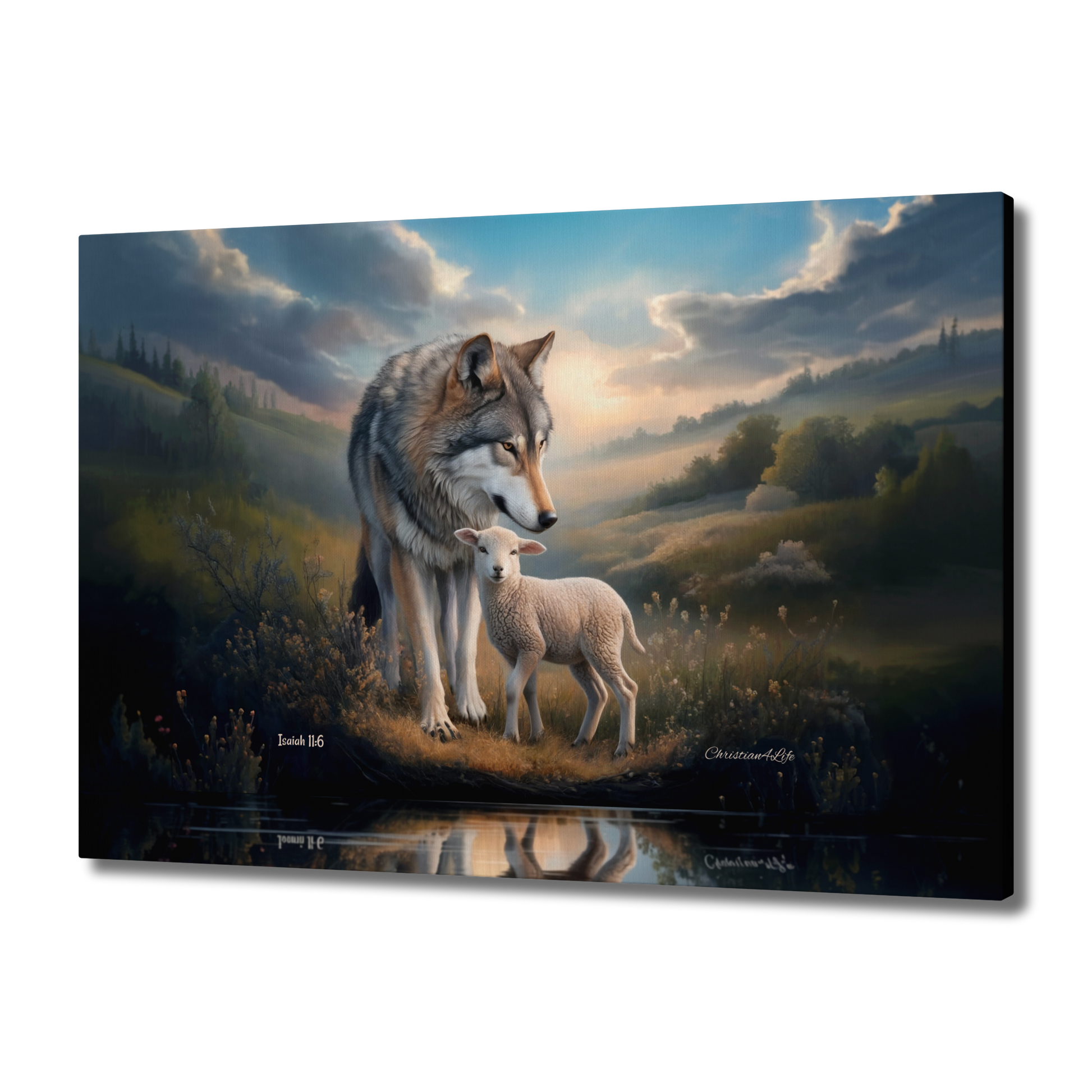 Wolf and Lamb Christian wall art brings Isaiah 11:6 to life, radiating peace and harmony. Its captivating design showcases nature's beauty, with serene water reflections. Printed on high-quality gallery-wrapped canvas, it boasts a durable and elegant finish that enhances any space. Ideal for those seeking to express their faith through meaningful decor, this piece effortlessly blends artistry with a profound biblical message.